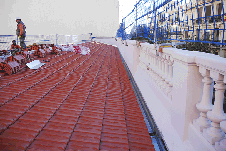 La rehabilitación del frontón Beti Jai de Madrid con tejas planas reproducidas según las originales.
